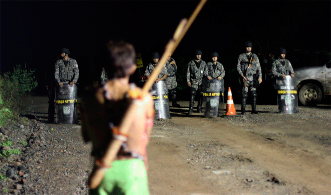 Ou índio tenta contemporizar. “Nós não tem raiva de vocês” e não entende porque os policiais estão “falando grosso”. O agente responde: “Vocês estão complicando meu trabalho.”